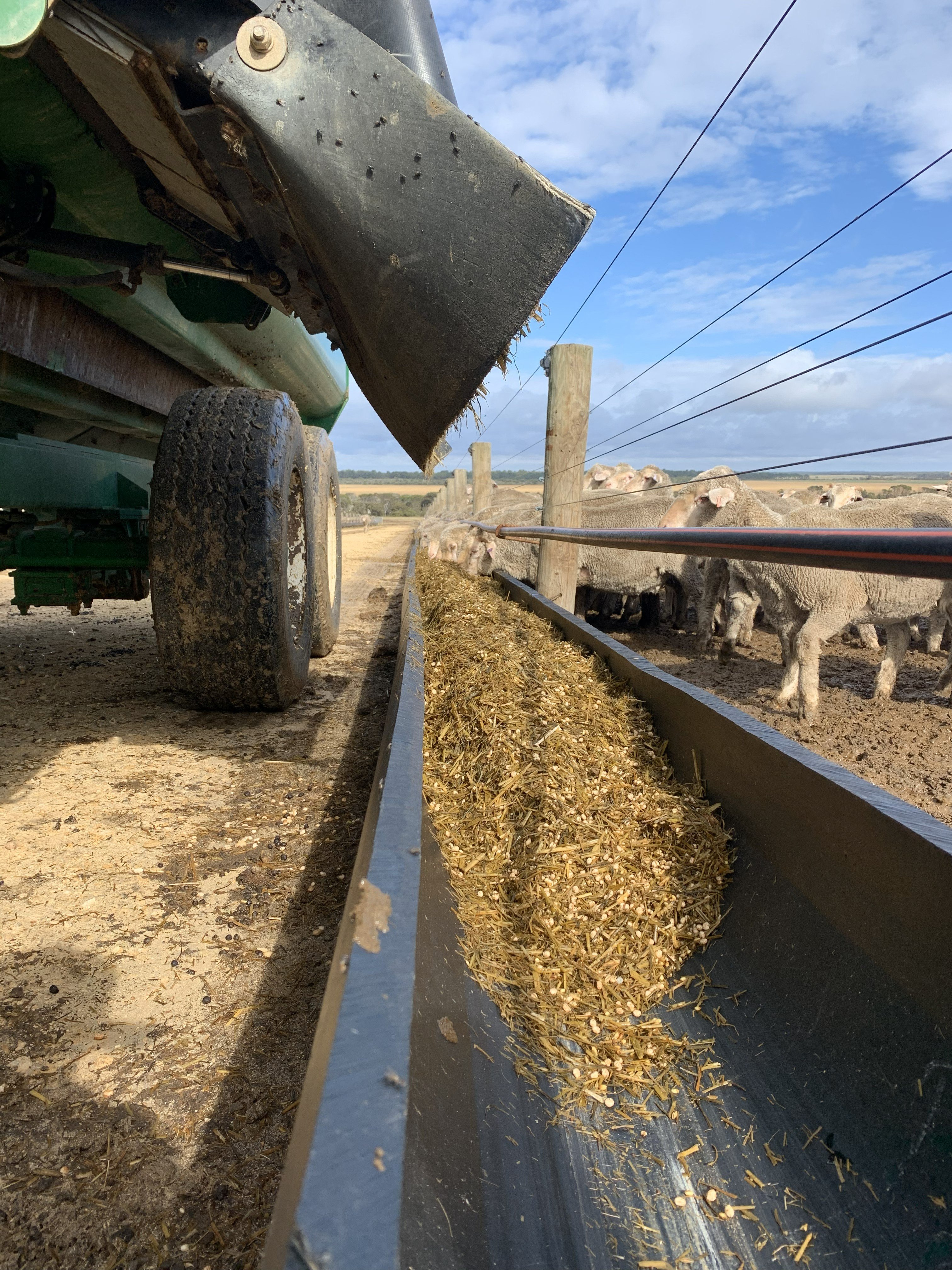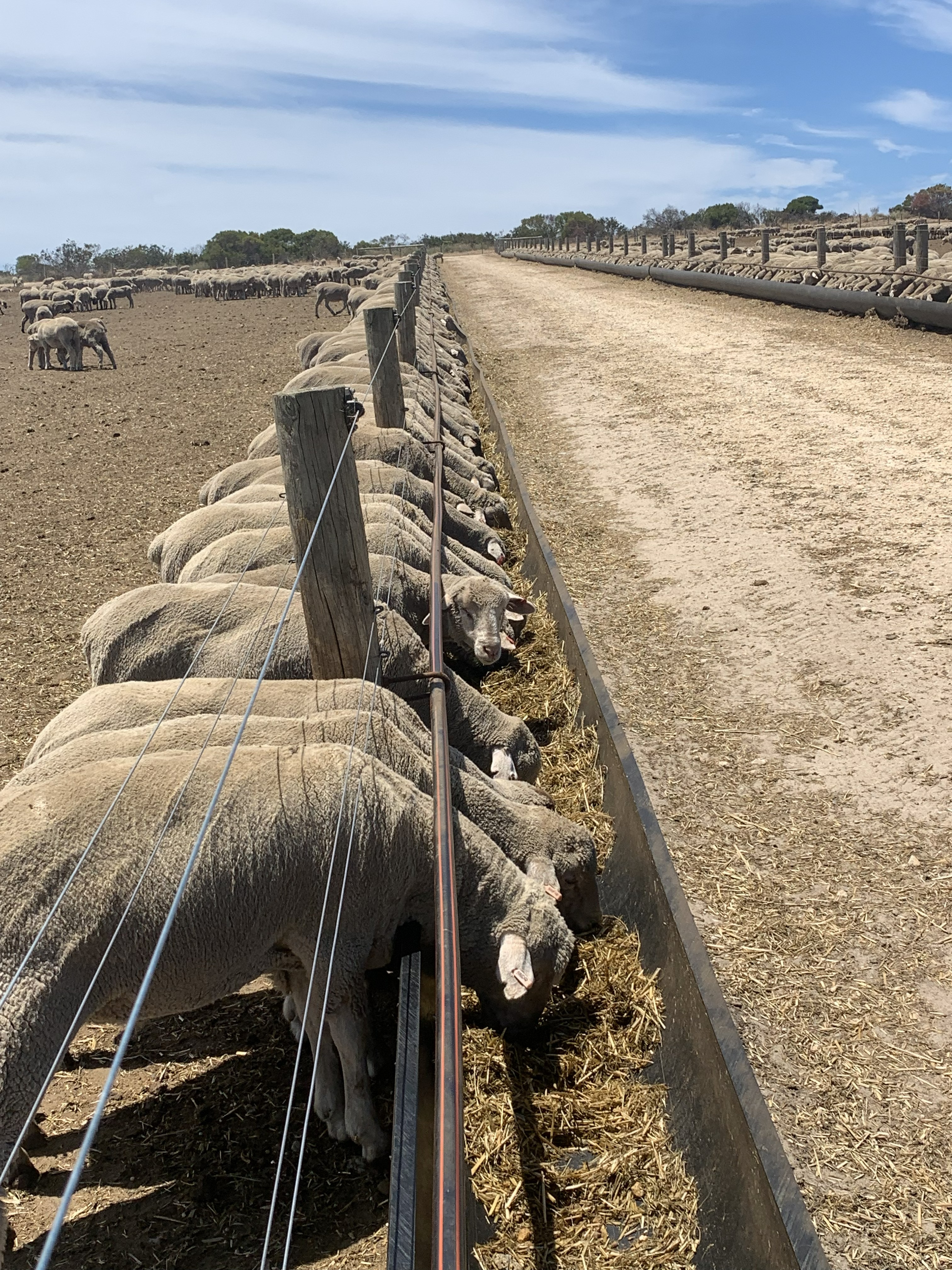 - Feeding efficiency - Simon utilises 100m x 150m pens that hold 700–800 ewes each with ~100 m of trough space. Simon employs an "outside-the-fence" feeding model, which allows staff to deliver rations in a straight line without entering pens, significantly reducing labour requirements