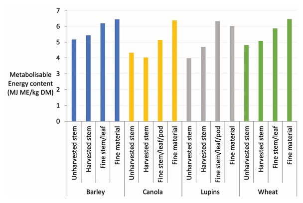 Sheep typically graze stubbles for 10-20% of the year in Western Australian mixed-farming enterprises. Stubble components include grain, leaf and stem, with their quality varying widely due to their chemical composition. For example, ripe stems are poorly digestible and subsequently have low nutritive value. Sheep tend to eat very little of the ripe stem and hence while these ripe stems make up a large component of stubbles, they represent very little of the diet of sheep grazing stubbles. Leaf and fine stem represent about half of the energy intake of sheep grazing stubbles. These components are more digestible and are therefore better, but still low quality compared to the ripe stems. The maintenance energy requirement of dry, adult sheep with mature weights of between 40kg and 60kg range from 7.6 and 9.7 MJ ME/hd/day when grazing. Unharvested grain provides sufficient energy to meet these maintenance requirements, whilst the non-grain components of common crop stubbles and chaff don't have enough energy to meet maintenance requirements. Hence, stubbles are initially a high-quality feed source but their quality rapidly depletes as the sheep eat the spilt grain. Improved efficiency of harvesting crops has also resulted in less grain being left behind in stubble paddocks. This is important to remember when grazing sheep on stubbles to ensure that they are maintained in good condition.